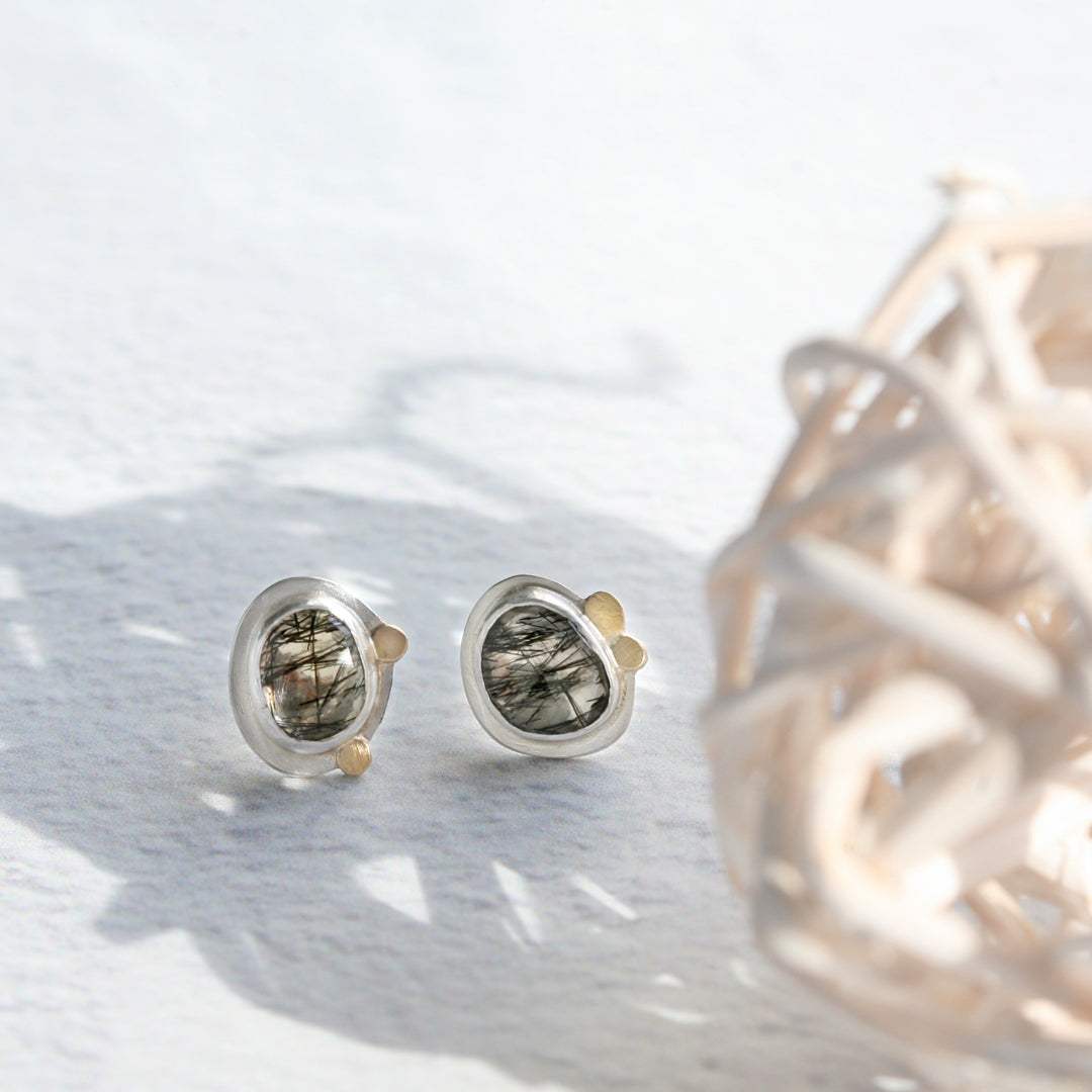 Black Tourmalinated Quartz Post Earrings in Sterling Silver and 18k Gold - ROSIE #1