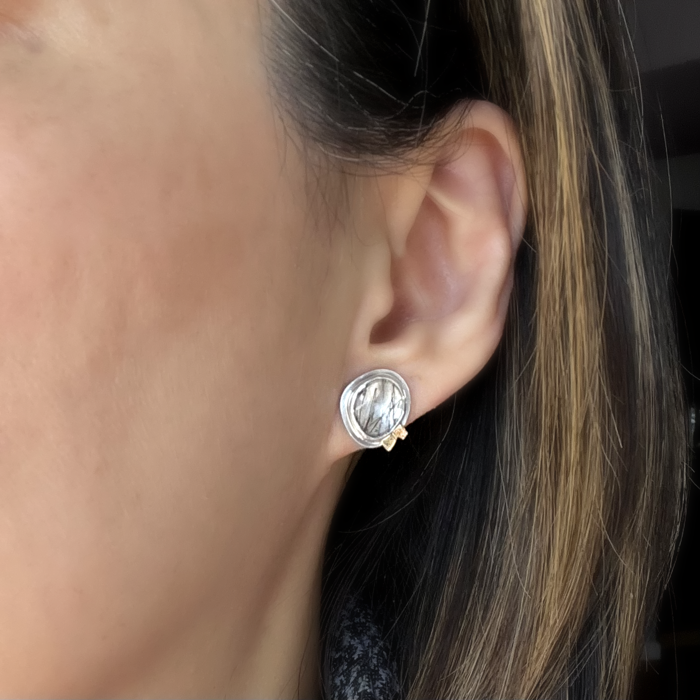 Black Tourmalinated Quartz Post Earrings in Sterling Silver and 18k Gold - ROSIE #3
