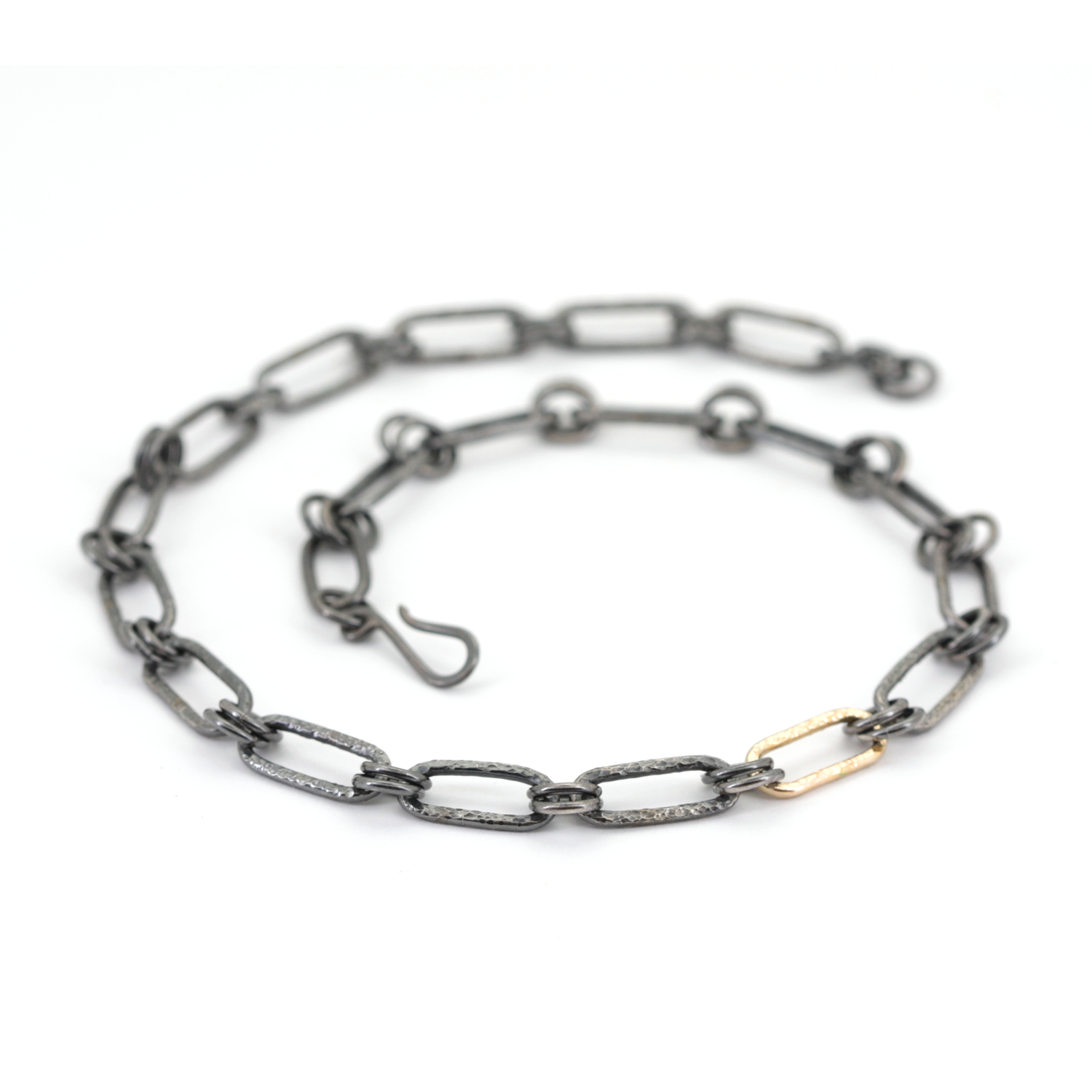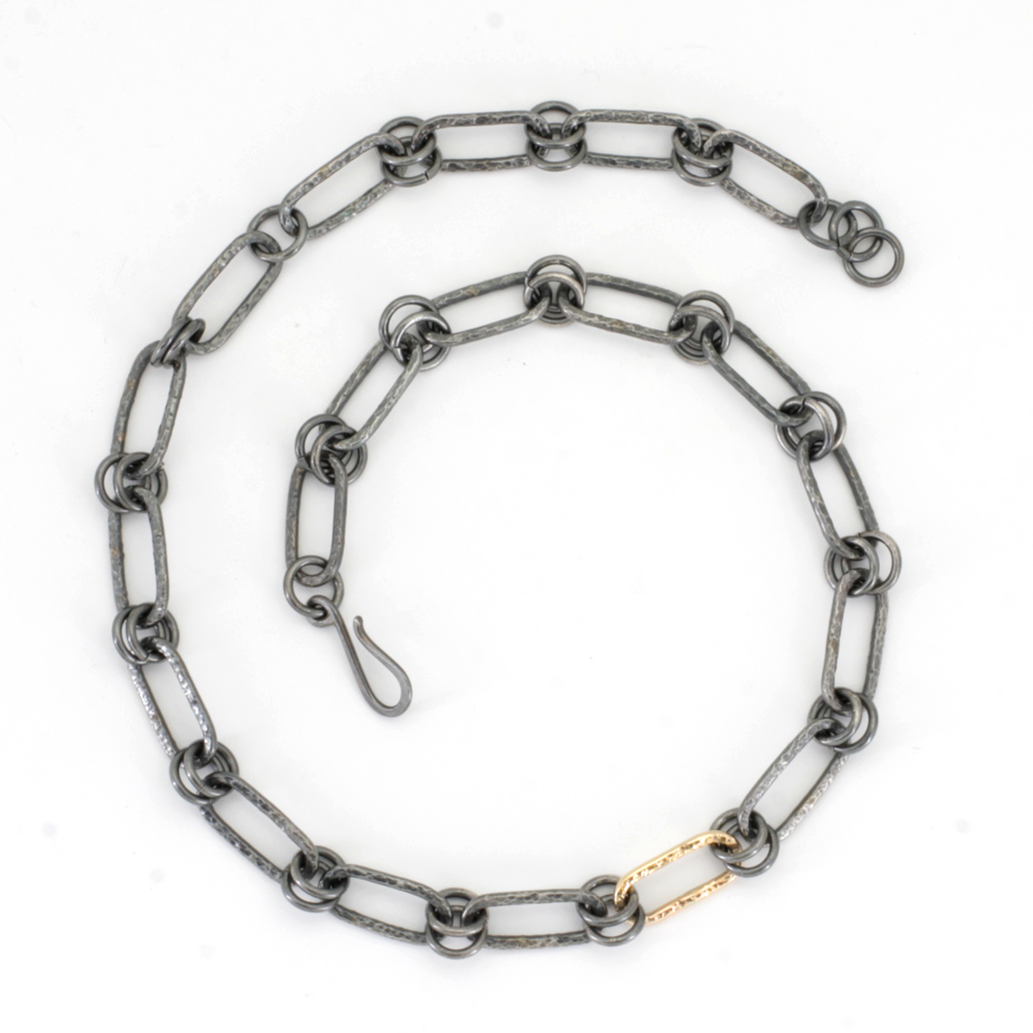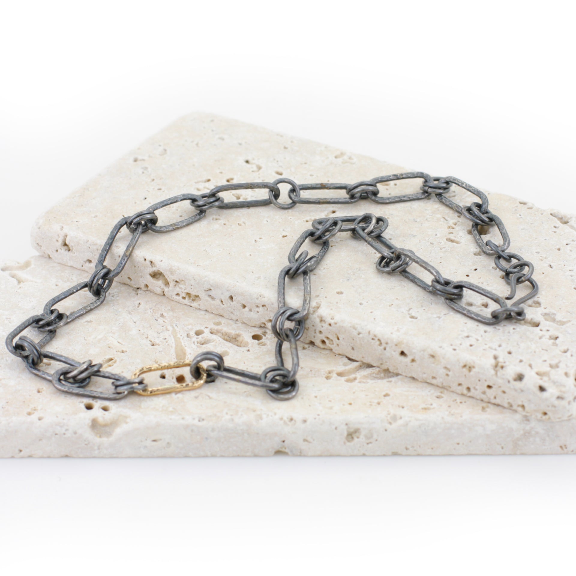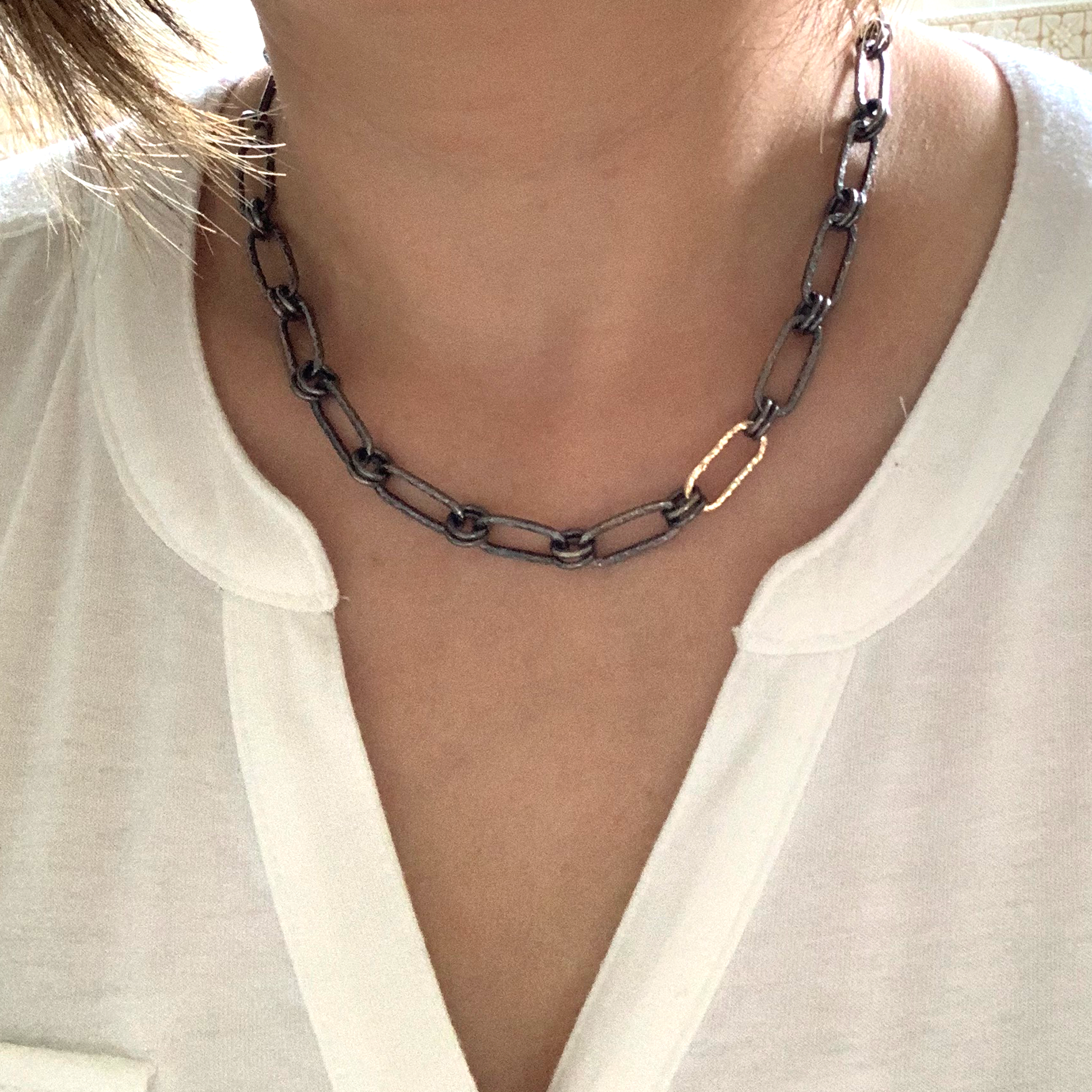 This simple yet bold silver chain radiates confidence. The oxidized textured links really make the yellow gold-filled link POP! This chain has a very nice weight. Great to stack with other necklaces.