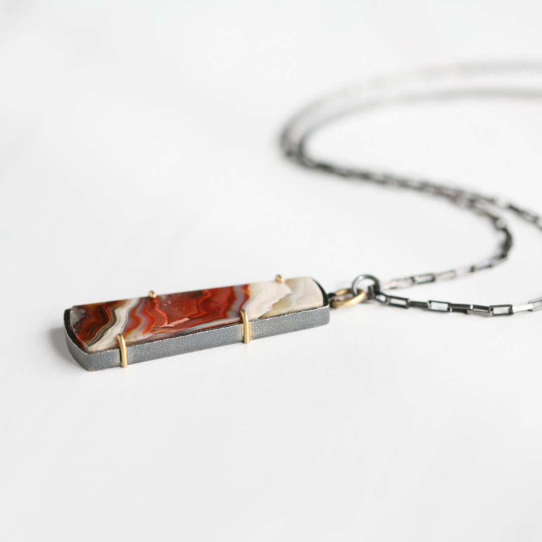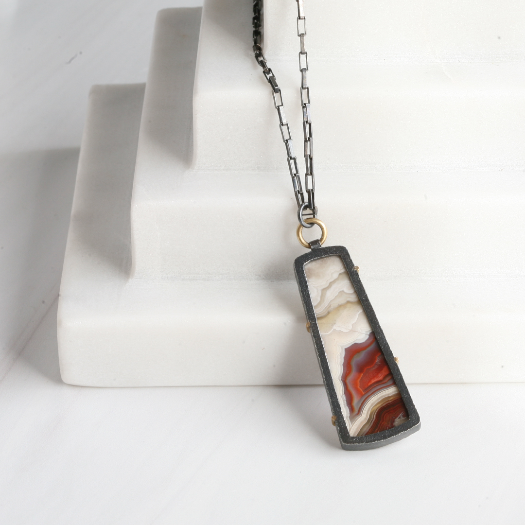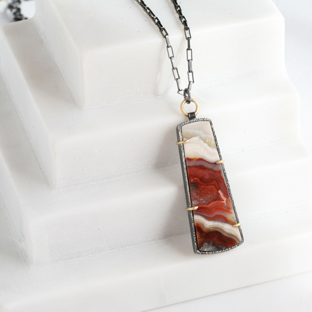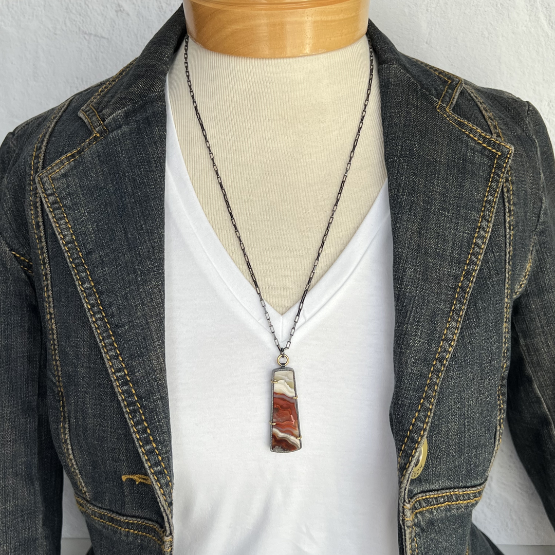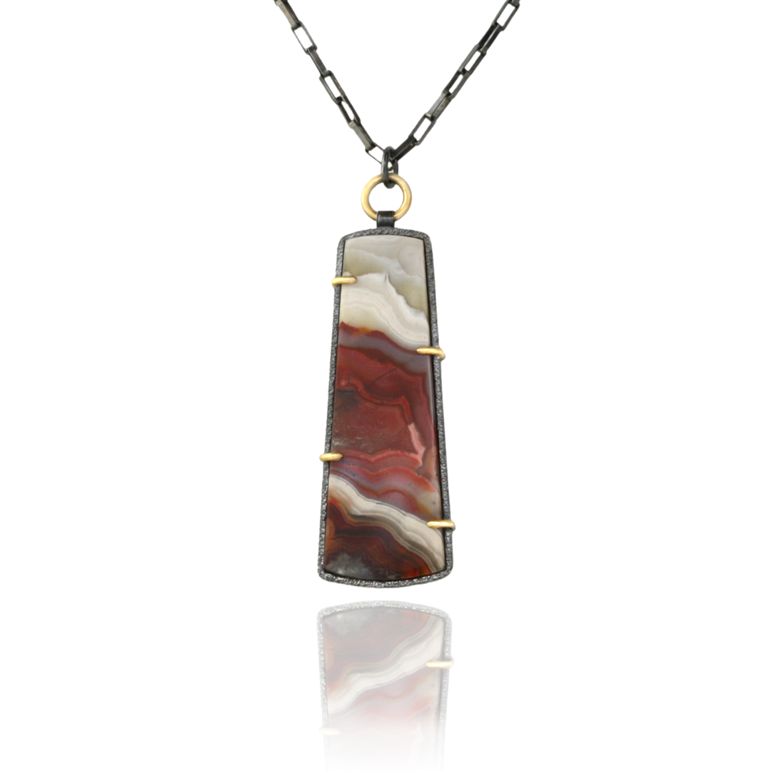Mexican Crazy Lace Agate Pendent Necklace in 18k Gold and Oxidized Silver - ROSA Necklace