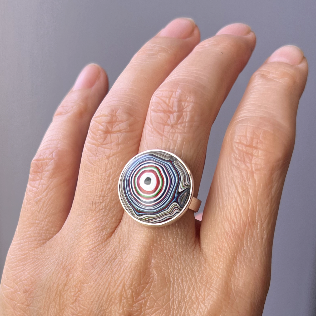Modern Upcycled Round Fordite Silver Ring - Detroit Agate Ring