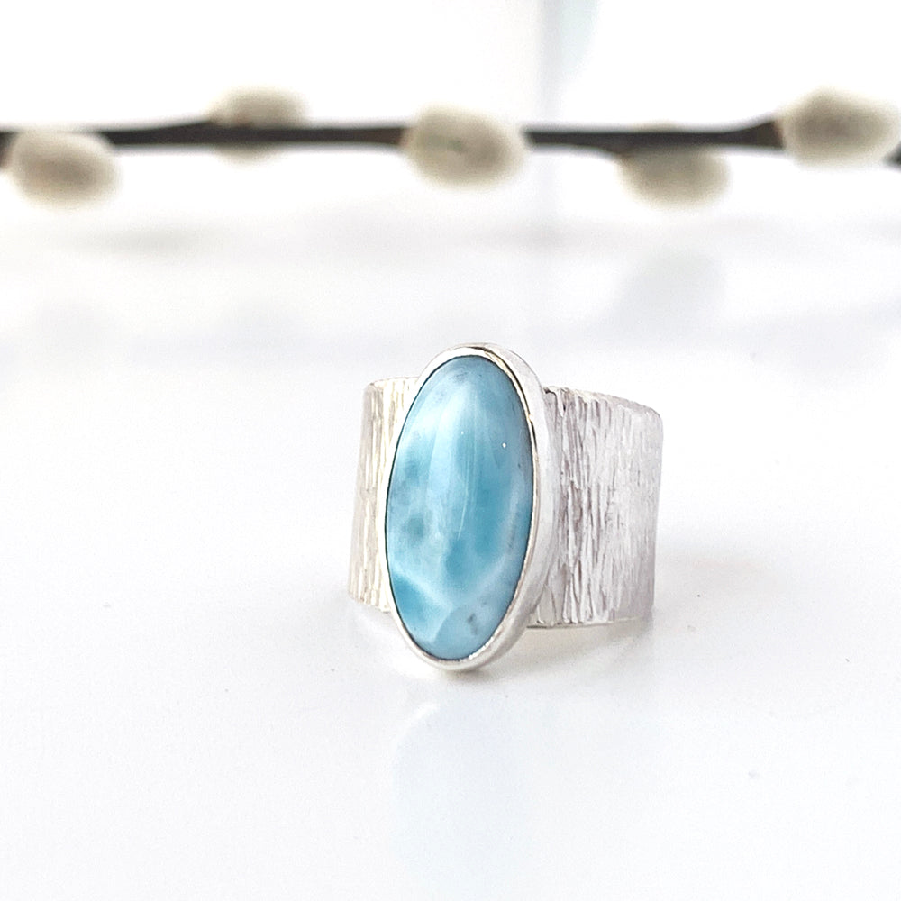 Larimar, the gemstone of the Caribbean, is prized for its incredible sky blue color and patterns. Can't you imagine a sunny summer sky with a light warm breeze at the beach? This is a beautiful cocktail ring that wants to be seen.
