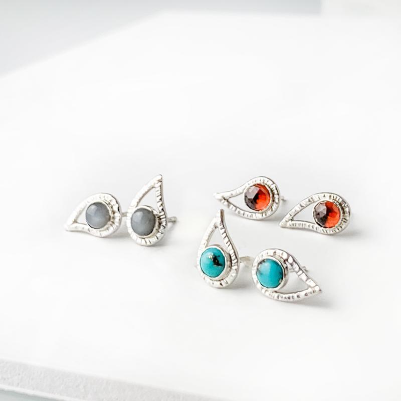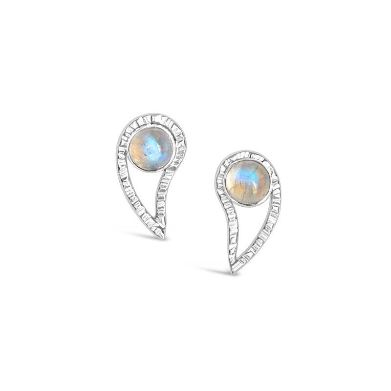 Silver Paisley Gemstone Stud Earrings in Rainbow Moonstone